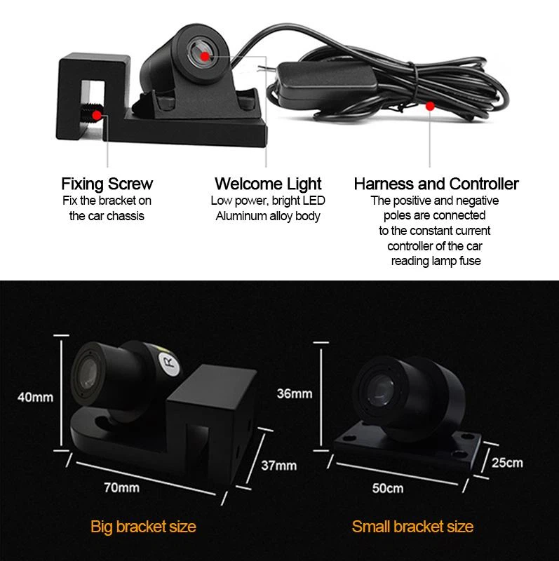 Choosing a large bracket for non-destructive installation, Install the bracket on the metal bar of car chassis. Choosing a small bracket for vehicles without the metal bar, fix the small bracket to the underpan. Then install the welcome light on the bracket. Suitable for all vehicles.