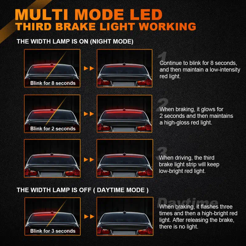 LED lights are one of today’s hottest styling upgrades, showing up on grilles, bumpers, side mirrors, running boards, and many more parts of the vehicle. And now you can add Third Brake Lights to the back of your car. When you running brake lights, creating bright display that will be appreciated by car and truck buffs. It lets your vehicle more dazzling. Beacuse its streamer lighting effect, multi-mode is more cool than single mode.