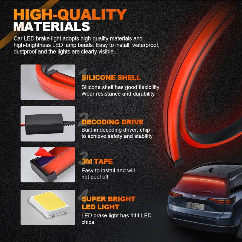 The LED brake light own 144pcs super bright LED lamps, environmentally friendly, no pollution, no radiation, long service life. Silicone Housing is good for waterproof, never afraid of any weather like rain, snow, etc.